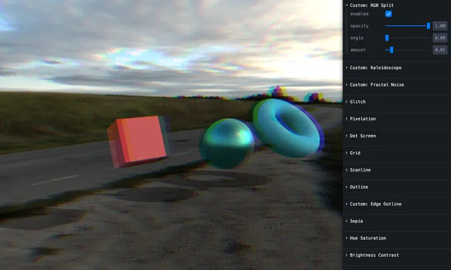 - @react-three/postprocessing と postprocessing を使うと、ビルトインで 20 種類以上のポストエフェクトを手軽に使え、Effect を継承すれば カスタム GLSL シェーダー も組み込めます。